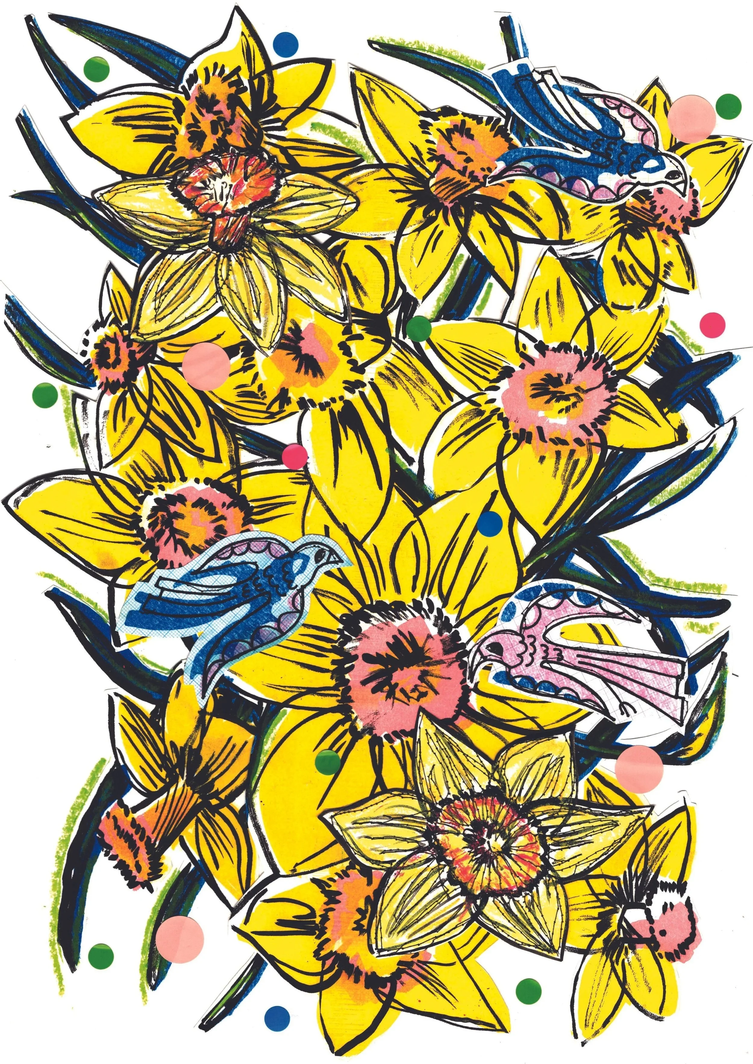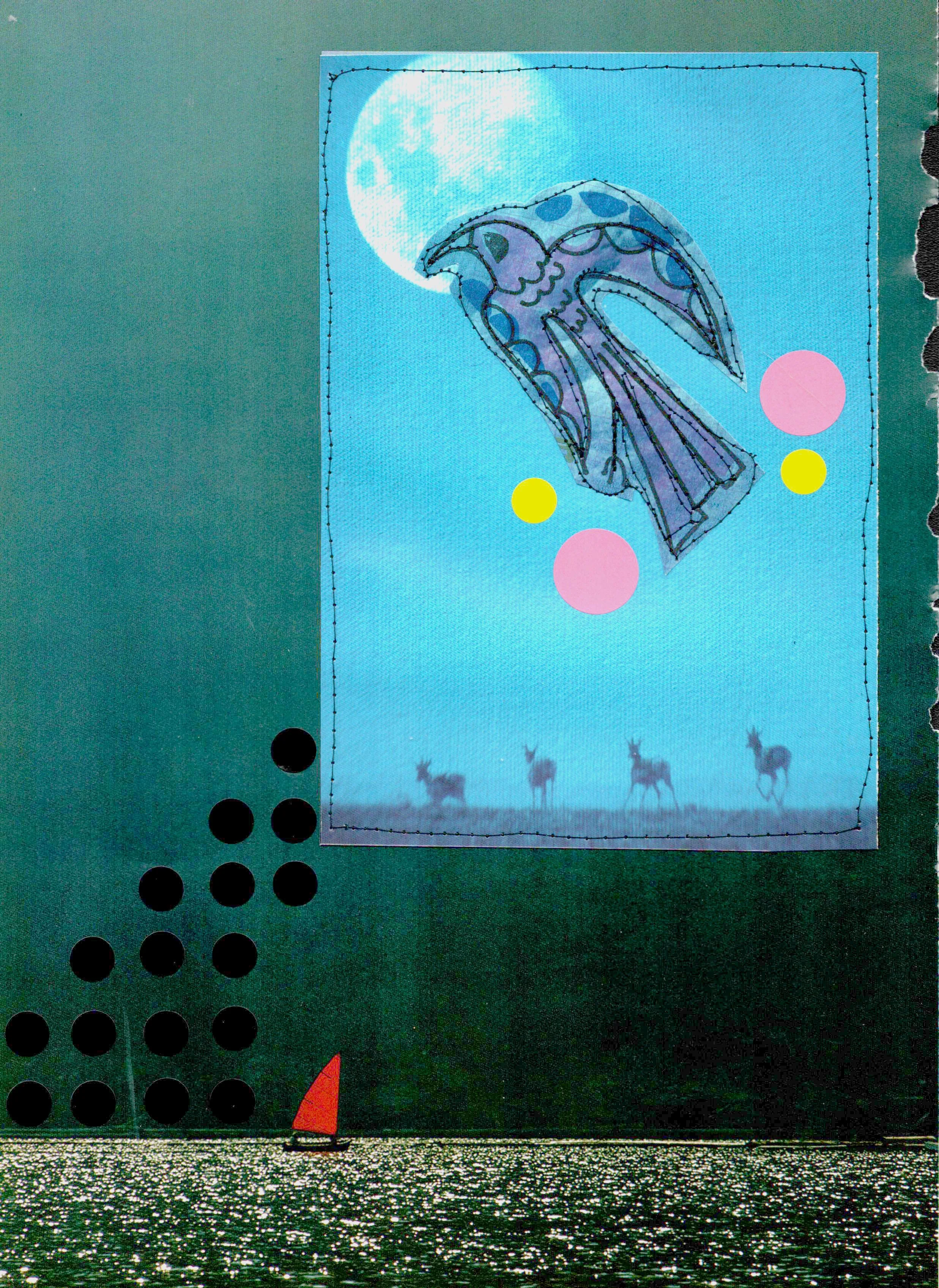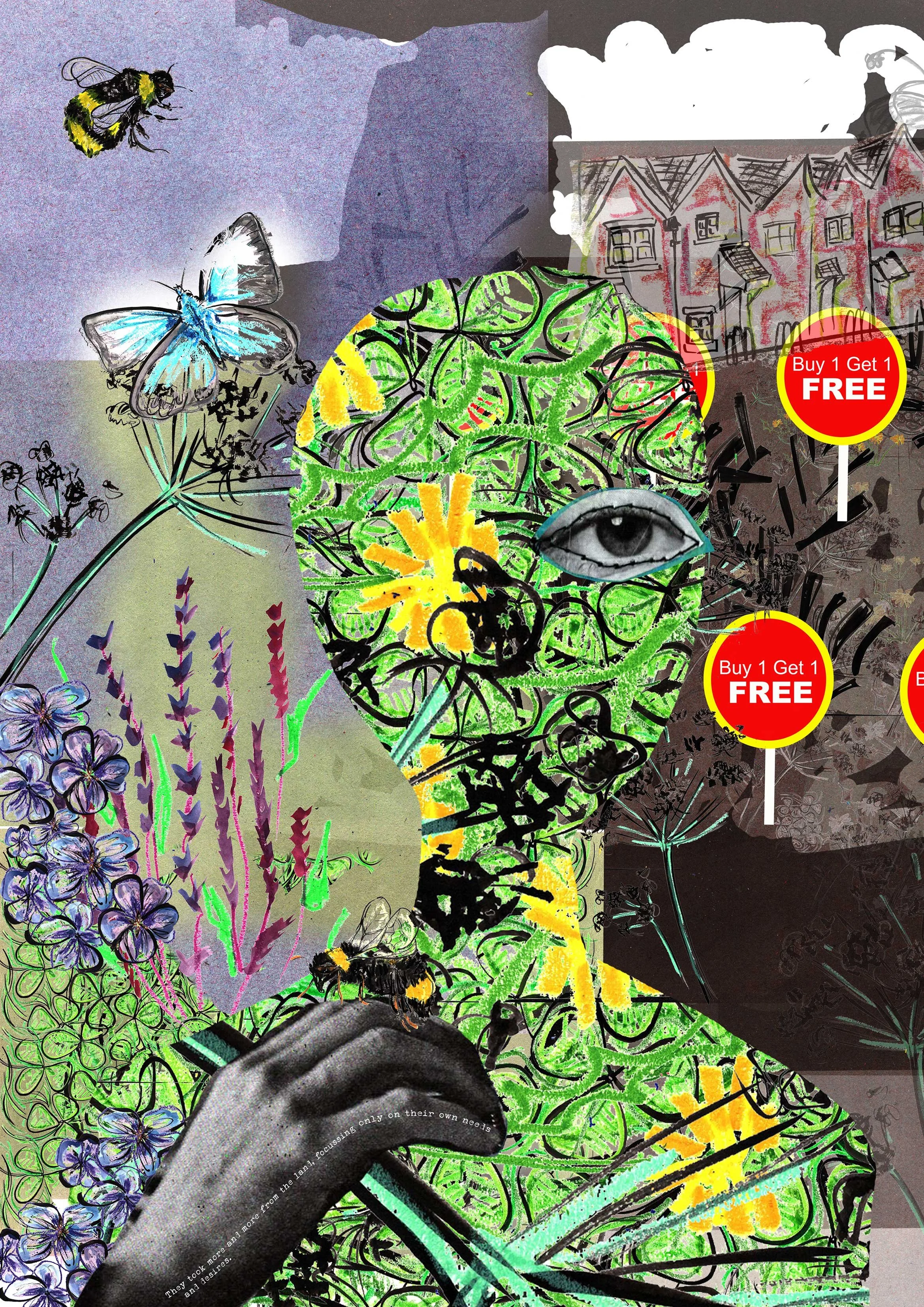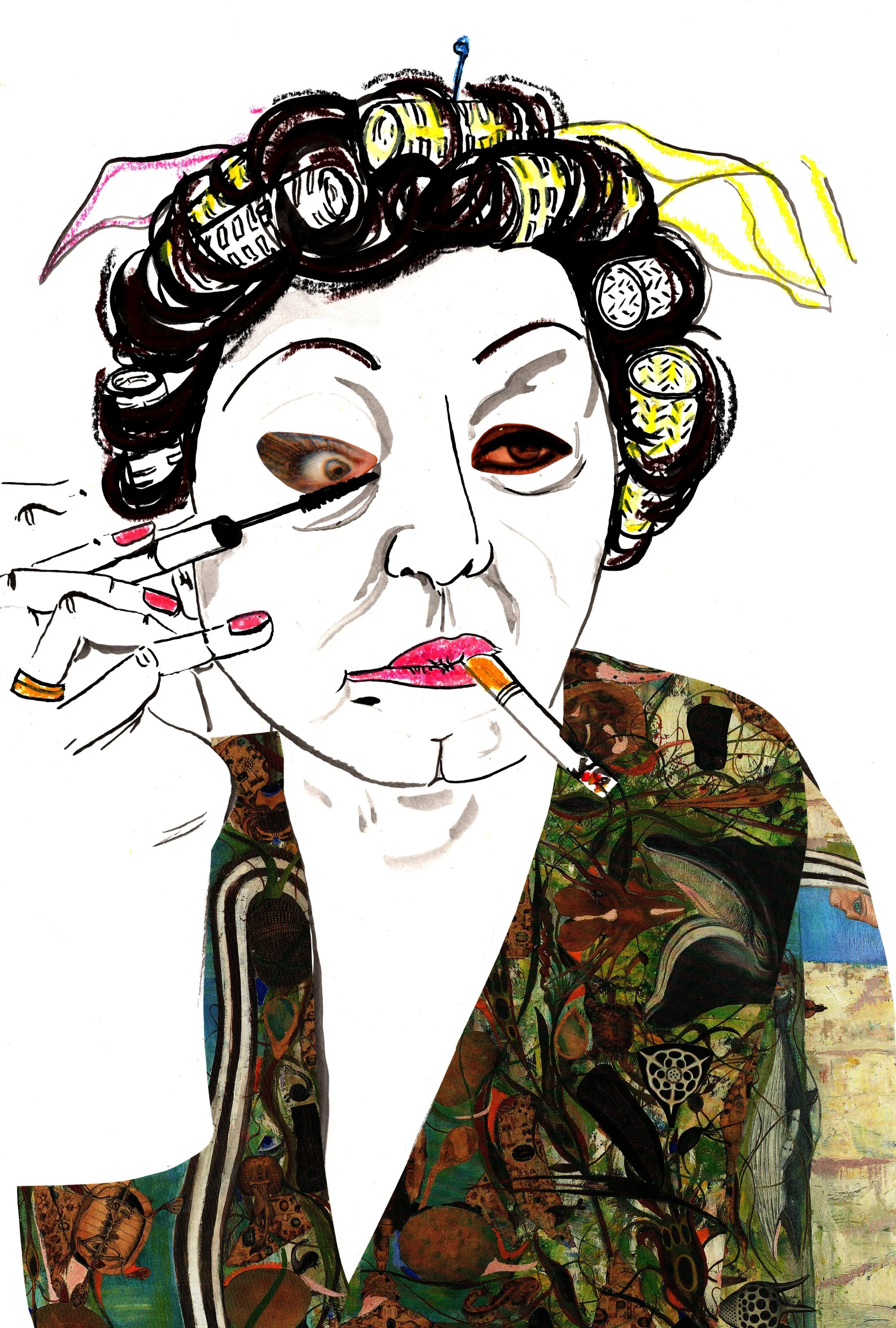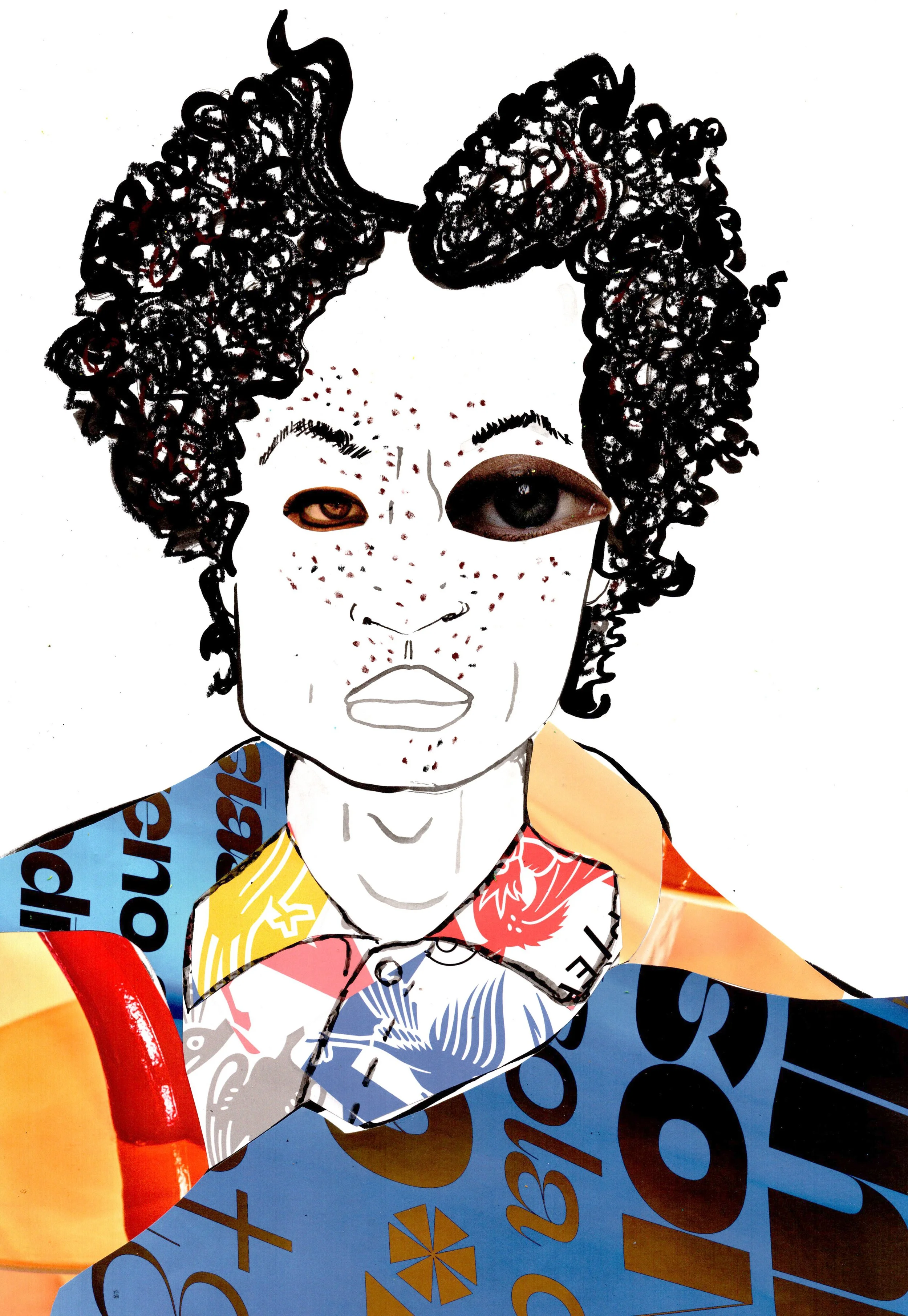 My love of faces has become an obsession, and I enjoy playing with different mediums. I always start with a black ink drawing and then add collage elements, which I sometimes Riso print or enhance with machine stitching for added detail.